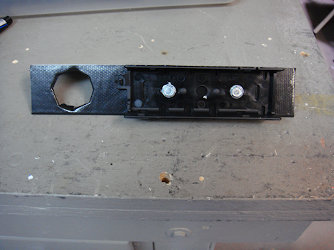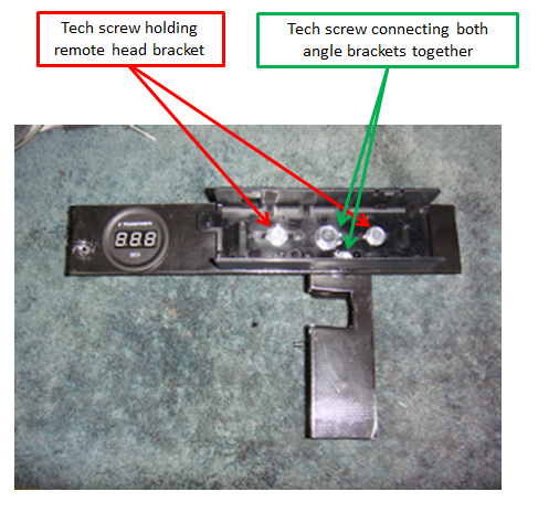 piece holding the remote head bracket and the volt meter. I used a large tech screw in the center of the remote head bracket and a smaller tech screw to the bottom right of the large one. In the picture to the right the “large tech screw” is the one in the middle of the remote head bracket. In the picture to the right – red are the tech screws that hold the remote head bracket is held to the angle aluminum, green are the tech screws that hold the two pieces of angle aluminum together.