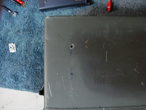 Once that was done I then used the measurement between holes on the radio to verify the earlier mark for the second hole on the same side of the box. I punched the starter “dent” and drilled the hole.