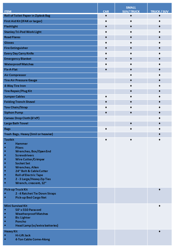 - Tool Kit – Check the chart above for a list of the minimum tools you should have. You are not trying to have complete repair capability, just enough to get you moving again.