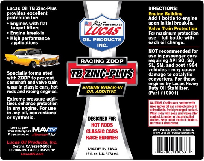 Vehicle application – Lucas Oil TB Zinc Plus is a zinc additive for engine oil. Its designed for engines with no catalytic converter in the exhaust. This product is also used as an engine “break-in” additive for newly built engines. For non-race, vehicle applications, one bottle will usually treat two oil changes. Some race-engine applications require the entire bottle. Classic cars (depending on oil capacity) require approximately 2,100 PPM (Parts Per Million) zinc in the oil.