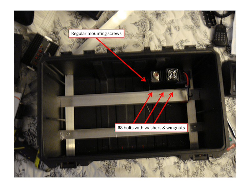 Next, I laid out the components to ensure they would all fit and be accessible as needed. The PWRgate warned about heat being generated by the unit so I decided to install it off to one side where I could install a cooling fan to blow air directly onto its heat sink. I had to implement a “remote head” installation of the Yaesu FT-8900R due to its overall size. If I didn’t the head would be too close to the lid when closed and I didn’t want to take the chance to damage it. It worked out great since it looks like a much cleaner install. I also took care to install the radio as far away from the heat generating PWRgate to avoid over heating the radio.