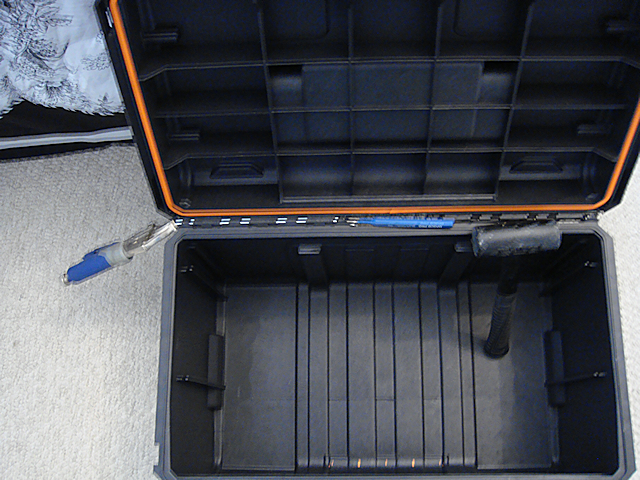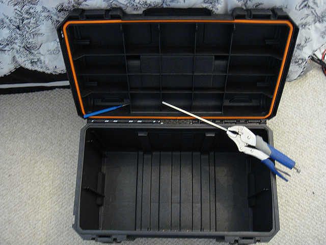 I laid out the first level of structural material (framing). I cut the upright 1-1/4” angle iron (aluminum) to fit very snugly into the box. The corners of the aluminum actually bite into the plastic. Once I had the uprights cut to length and placed in the box I then placed the lower cross-member into position based on securing the AC power supply that would be placed at the “bottom” of the unit when the box was placed on its side during operation. That was due to the power supply’s weight; it was the heaviest item that would go into the box.