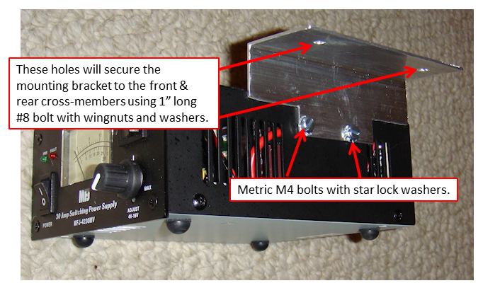 Now it was time to get the AC power supply placed and secured. But as I was looking at that part of the build I was thinking this might be the time I could combine the structural parts. So I measured and placed a lower cross-member and put it in-place to secure the AC power supply. As I did so I realized that could use that same cross-member and the other lower cross-member as the “base” to install the battery booster too. But I had to space the cross-members to match the width of the booster’s base and mounting holes. A little giggling around and I got it all lined up. Then came the challenge to secure the AC power supply to make sure it wouldn’t move around. But, there was a problem that the height of the AC power supply was just a little too tall for the front cross-member. Solution – cut a small notch in the front cross-member to offset the height issue. The side-benefit to doing so was a very secure mount for the AC power supply. All that being said I did cut a small mounting bracket to mount the AC power supply to both the front and rear lower cross-members. That added extra stability to the overall lower structure. Notice I had to cut out some area of the mounting bracket to keep the AC power supply’s cooling vents free of obstructions.