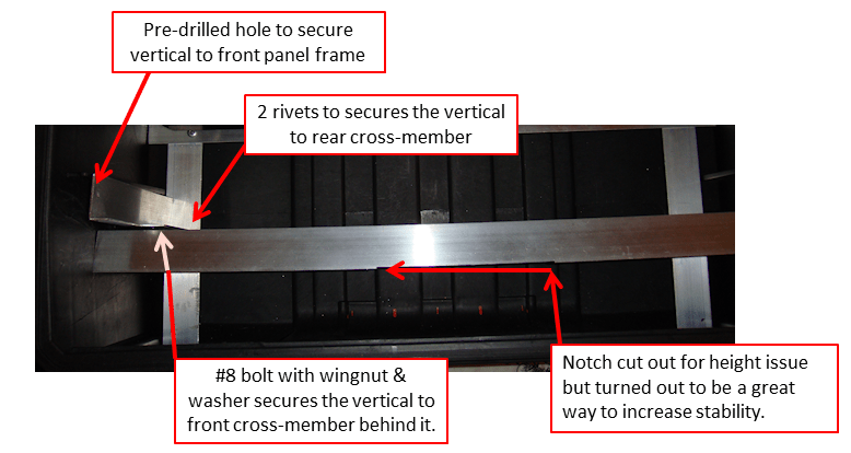 I used 2 rivets to secure the lower part of the vertical support to the lower rear cross-member. But for the front lower cross-member I used a #8 bolt with wingnut and washer to allow the removal of the front lower cross-member that would help me if I had to move the AC power supply.