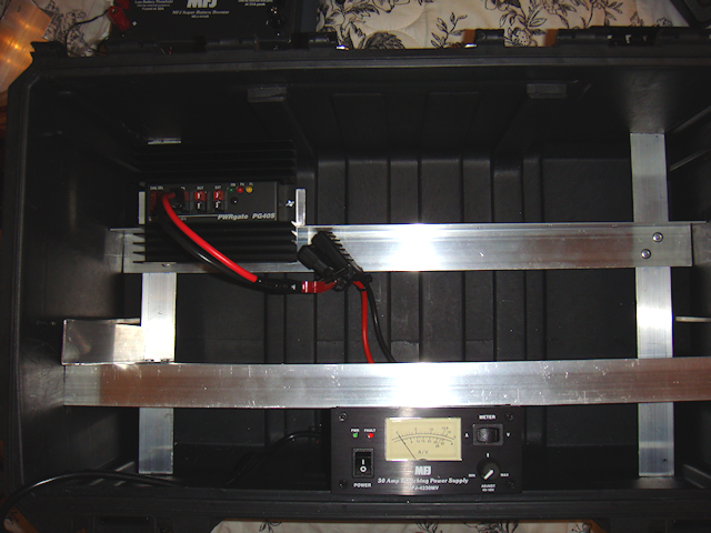 Next, I laid out the components to ensure they would all fit and be accessible as needed. The PWRgate warned about heat being generated by the unit so I decided to install it off to one side where I could install a cooling fan to blow air directly onto its heat sink. I had to implement a “remote head” installation of the Yaesu FT-8900R due to its overall size. If I didn’t the head would be too close to the lid when closed and I didn’t want to take the chance to damage it. It worked out great since it looks like a much cleaner install. I also took care to install the radio as far away from the heat generating PWRgate to avoid over heating the radio.