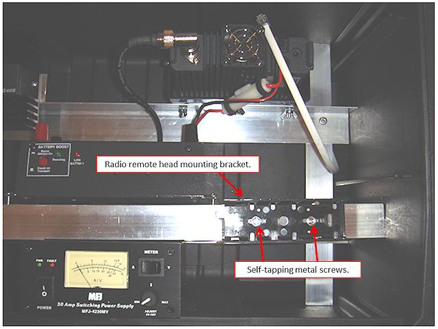 Next came placing the radio. I based the top cross-member’s position based on the radio unit’s size; I wanted the radio to be up and out of the way. I also wanted the rear of the radio to facing outward for access to the power cable, data port and antenna coupling. That positioning also allows for the fan to move the unit’s heated air to the outside of the box.