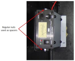 is a little off when it comes to standard dimensions for mounting brackets. I don’t like reinventing the wheel if I don’thave to. I took one of my spare Yeasu radio mounting brackets and added spacers to make it work for the MFJ power supply. I wanted the meter to be easily read but I also wanted to maximize the airflow around and through the unit itself. Hence, mounting it on the left side of the box with the bottom facing away from the side of the box.