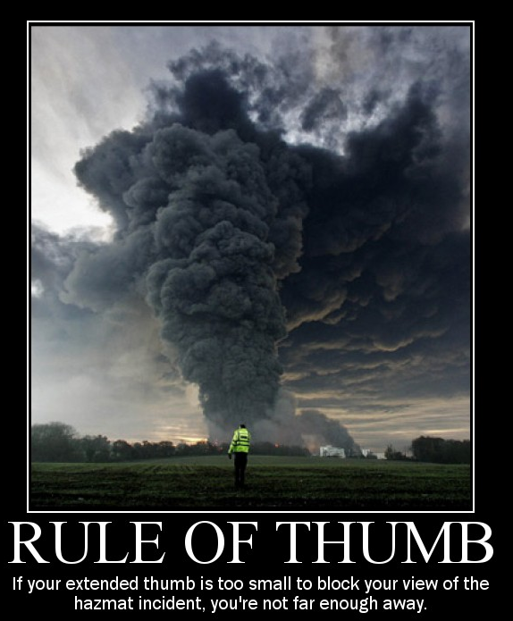 When I was still a structure firefighter we used the “Rule of Thumb” for hazard materials incidents. While holding our thumb out in front of us and looking at the Hazmat scene, if we couldn’t cover the entire hazardous materials incident with our thumb we were too close.