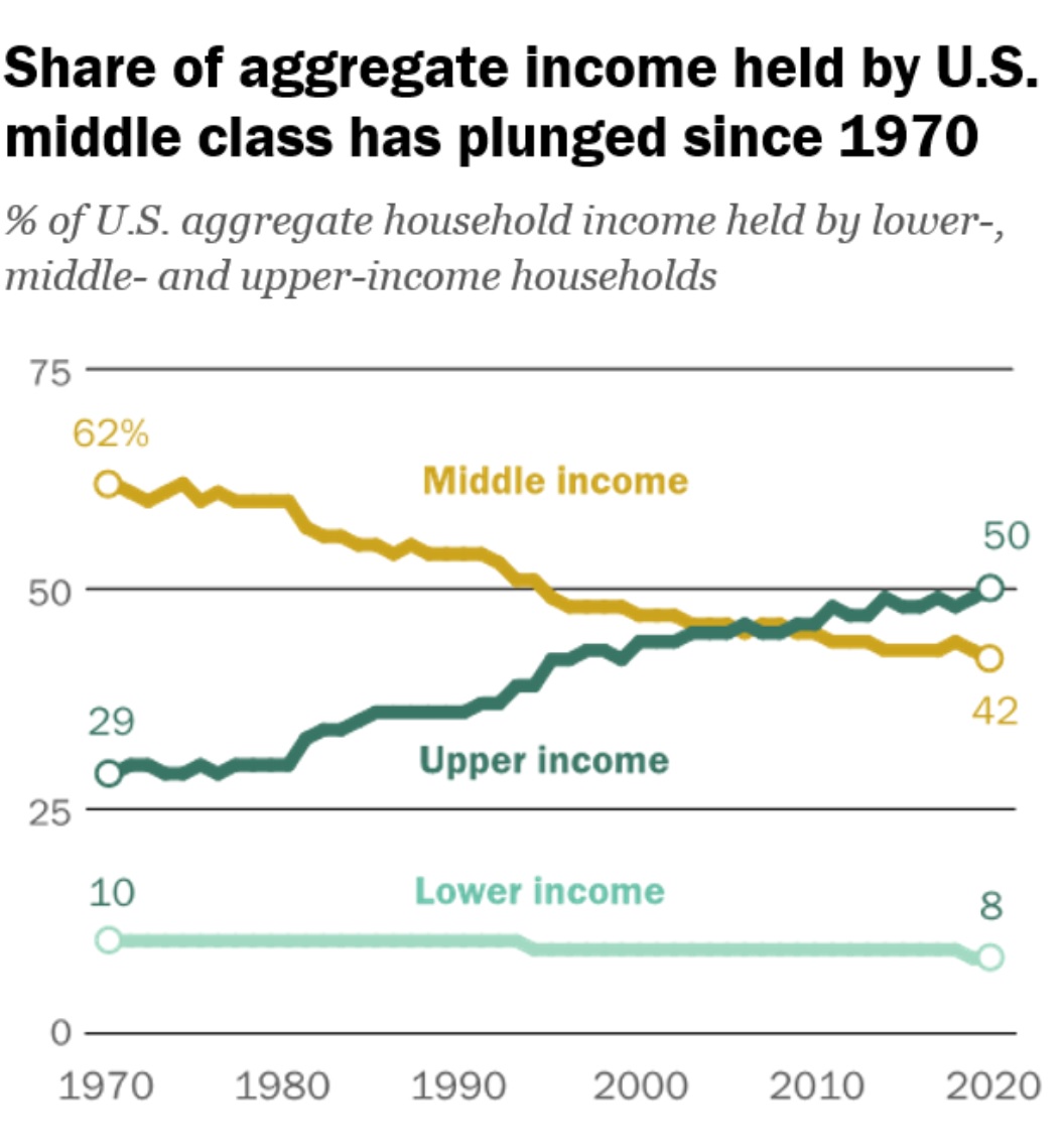 Since 1970 the US rich have gotten notably richer, the poor have gotten marginally less poor, but the middle-class has been decimated by comparison.