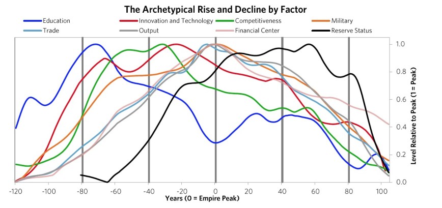 Now, the most researched, documented, and clearly written information regarding empires that I have ever seen has been produced by a guy by the name of Dalio. He went into factual scientific detail, extreme detail, regarding the rise and fall of the great empires in the last 500 years. So let’s start with this…a chart that shows the life-cycle of an empire: