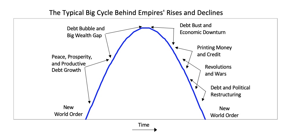 Now, the most researched, documented, and clearly written information regarding empires that I have ever seen has been produced by a guy by the name of Dalio. He went into factual scientific detail, extreme detail, regarding the rise and fall of the great empires in the last 500 years. So let’s start with this…a chart that shows the life-cycle of an empire: