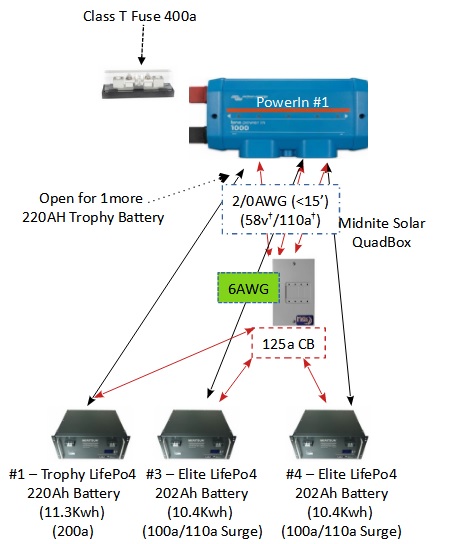 With the PowerIn each battery will have equal length 2/0 cables capable of carrying at least 200amps. When complete, each battery will also have a Bluesea 175a high current MRBF Terminal Fuse mounted on the positive terminal to each battery. The MRBF fuse will isolate/protect each battery in the case of a high-current dead short. Yes, I know I am over-engineering the system. But, I am trying to give it as much redundant protection as I realistically can.