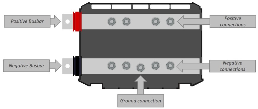 There are 6 connection points on the positive bus bar and 7 connection points on the negative busbar, one of which is a ground connection. And remember, the busbar is 1000amp, made from solid copper with plating…making it even better than copper only. You can connect batteries, loads, chargers, etc. to the busbar as needed/required.