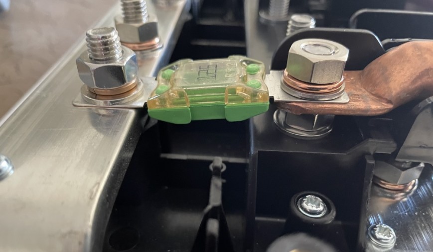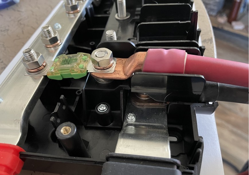 Added the Class T fuse holder plastic protective cover and all was good. The cover protects any accidental contact with the terminals. Yes, I used a Bluesea Class T fuse…you can’t get much better quality than Blesea.