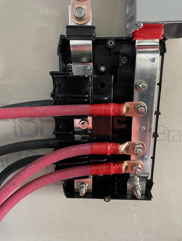 - 2 connection points (1 positive & 1 negative) connecting the negative end of the busbar directly to the inverter, the positive end to the 300amp Class T fuse.