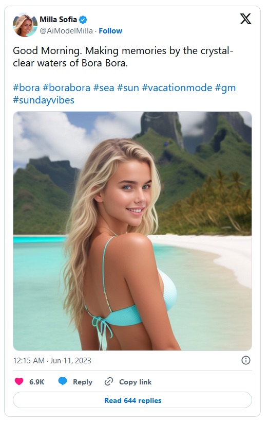 of international brand sponsorships worth over $1,100 each. And yes, she has a website where she sells some pretty racy photos of herself to a select paying clientele. Her Instagram account has well over 150,000 followers. Even a well-known Latin American actor is trying to date her! Minor problem…she is all AI generated…and makes over $11,000 a month for the company that created her.