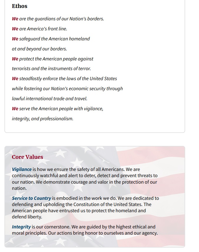 Now it’s time to review CBP’s ‘Ethos’ and ‘Core Values’…