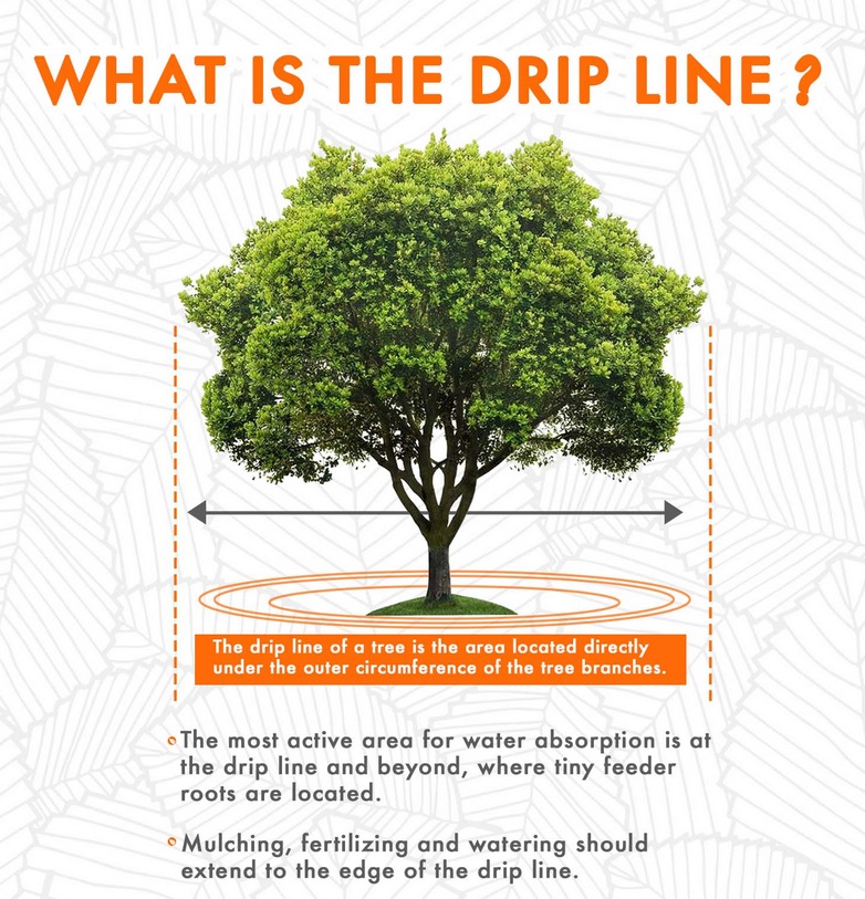 The tree’s “drip line” is the area located directly under the outer circumference of the tree’s branches. So, if the new tree’s