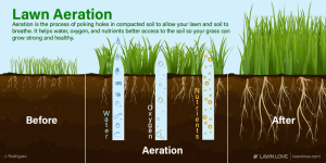 1-1/2”, aerated the soil, applied a full application of Sta-Green Fertilizer plus Soil Conditioner, along with some peat moss, to the lawn, and watered it in well. Aerating the yard allowed oxygen, water, and nutrients to get deeper into the soil…and that drastically helps roots to grow stronger and deeper. Going forward I will probably try and aerate 2 – 3 times a year if needed.