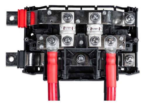 First off, there is an internal 1000amp busbar…plenty of busbar to handle the system’s current. And there are two connections to that busbar…each protected by its own Class T fuse. Why is that important? Should a catastrophic current overload (massive amperage) occur sending current into the battery bank, both sets of batteries are protected with a 225a Class T fuse. Should the current overload originate from a battery, the set’s Class T fuse will isolate the set of batteries from the system and the other battery set.
