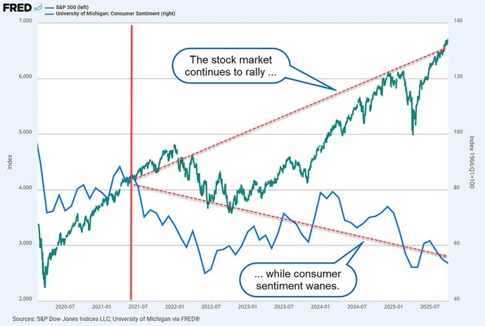 widened, with sentiment souring as those in the middle of the income distribution were pressured by a softening labor market and feared inflation resulting from tariffs.”
