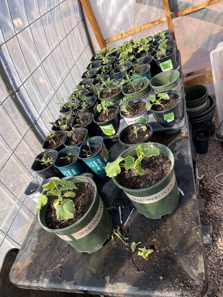 The transition from seedlings in the house on a heat mat to the greenhouse went really well. The plants were doing fantastic and this year I was able to spend enough time to do it right. We had lots of tomato plants, butternut squash, couple varieties of cantaloupe, and couple varieties of watermelon. The early start to cantaloupe and watermelon was based on our short growing season…I wanted to give us a jump start on it. We had about a total of 80 plant starts in the greenhouse.