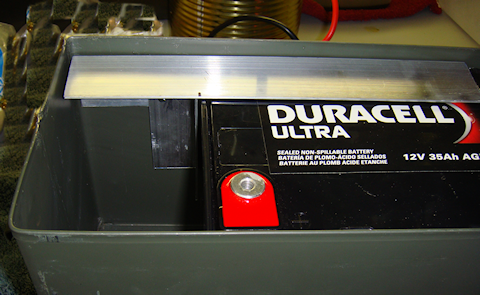 movement towards the lid. I used a piece of 1-1/4” angle aluminum. I secure it to the box with pop rivets since this piece will not be removed from the box. Notice I used Gorilla Tape later to “pad” the piece of aluminum and to make it a bit more “sticky” helping to keep the battery from excessive movement.