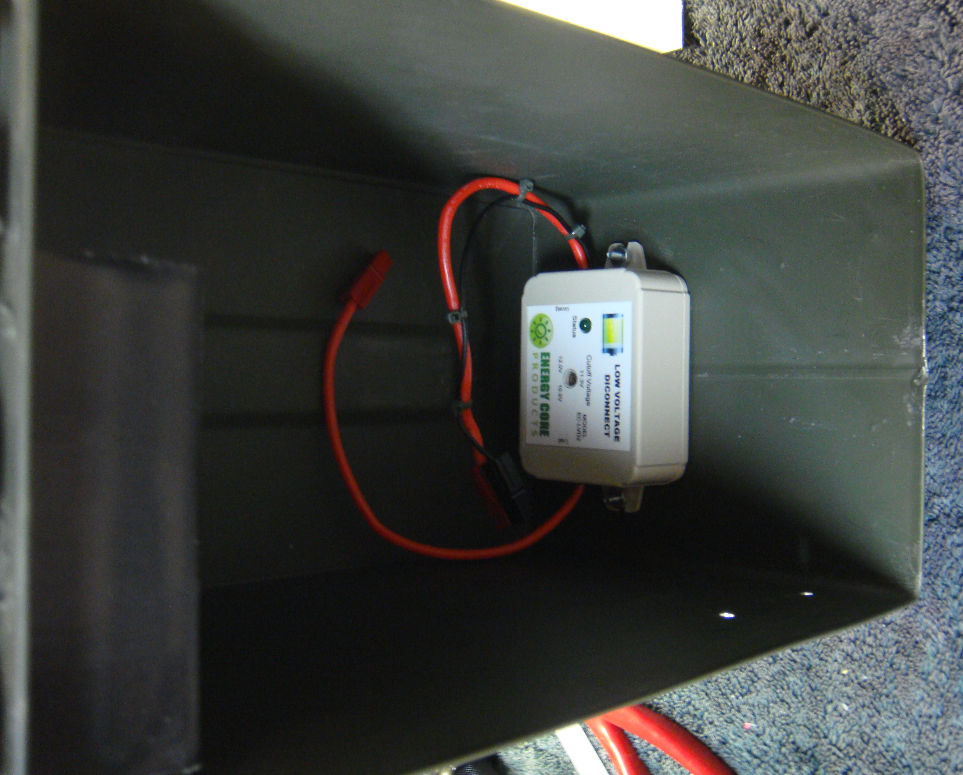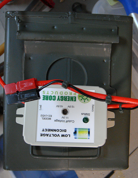 I had thought long and hard about installing an LVD in each radio box, but realized the proper location is the power box itself. I am using the Energy Core EC-LVD2. However, there is no temperature sensing by the LVD unit. So I will have to see how true to the voltage the cut-out point is. Also, I adjusted the “disconnect point” on the LVD to the highest setting it has to protect the battery, 12v. I did the adjustment outside in hot weather. Why? Because that is the most probable environmental condition that I will be operating the power pack in.