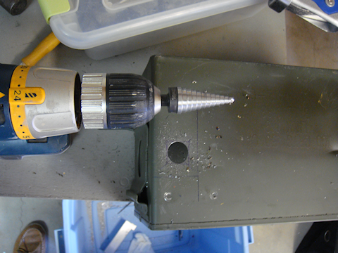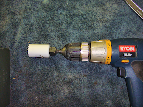 I have a 1″ metal hole saw that works really well through tougher metal and figured why not use that to remove the majority of the metal from the hole.