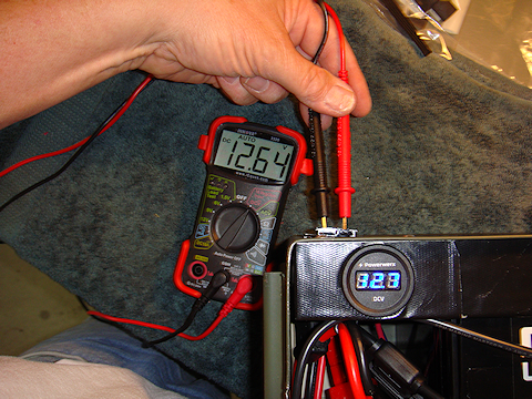 As always, before putting the power box into operation I had to test the entire system. I test it one component at a time as I hook each piece up. I get a volt reading directly from the battery that becomes my baseline. Then a reading through the ATC fuse connection. Then hook that to the Powerwerx Red-Dee-2 power splitter and test each outlet of the splitter.
