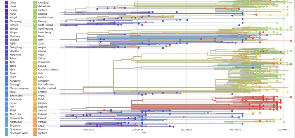 From what I can gather, and remember I am no expert, it appears that COVID-19 (novel coronavirus hCoV-19) has mutated into three major/distinct strains. It looks as if, in general, one major strain is concentrated in Asia, the other in Europe and surrounding areas. The third, more minor, is concentrated in the US, specifically Washington state. The latest mutation, about a week ago, occurred in the third strain and was identified by researchers in Utah.