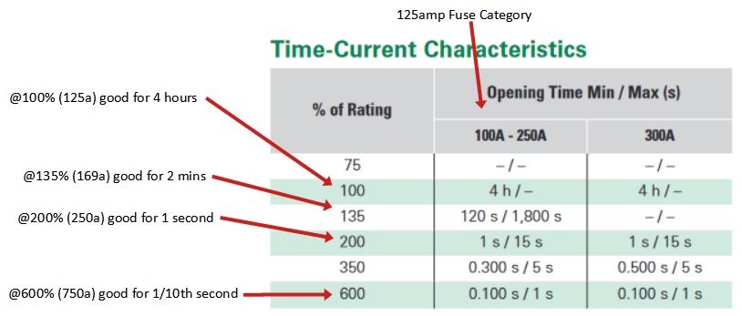 And here is another thing to consider when deciding on the correct fuse to use…its different ratings. So take a 125amp/58v BF-2 fuse from Littelfuse. It is rated at 125amps, yes? But does that mean it will blow as soon as the current hits 126amps? No. If you review the chart that accompanies the fuse you will see it will maintain integrity for different lengths of time at different currents (amps).