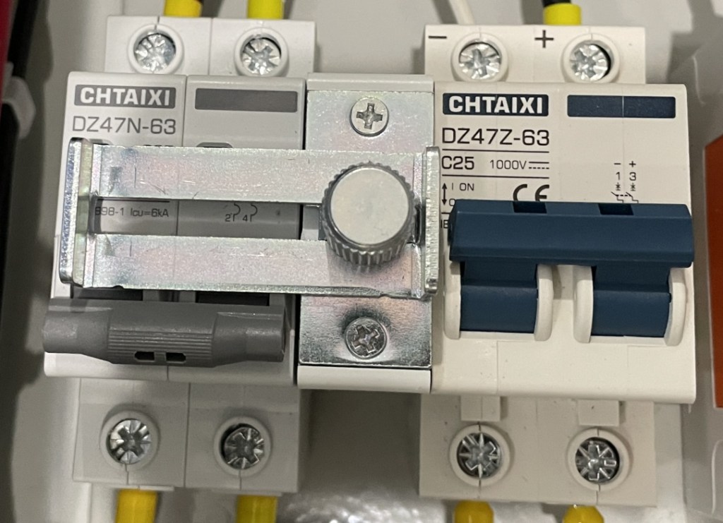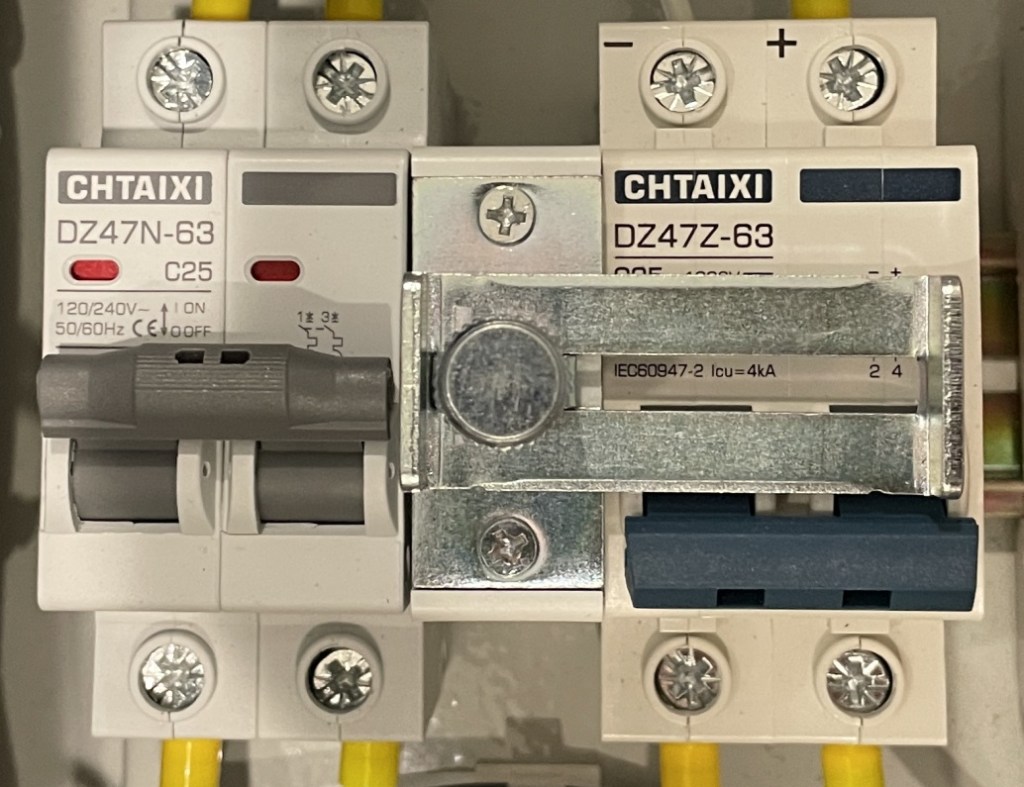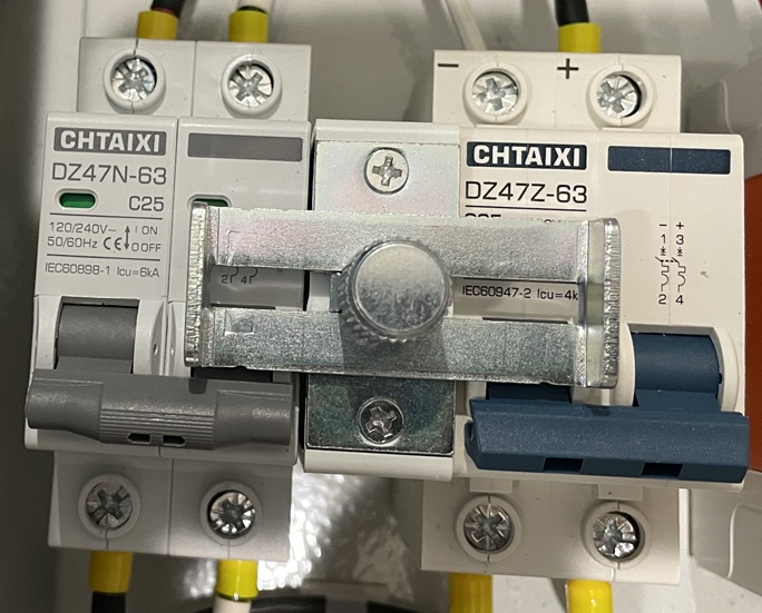 Problem:Mollum MCBs are not compatible with the interlock I purchased. Mollum breakers have the flip lever in the vertical middle of the unit. The interlock won’t slide with that configuration. So I purchased two Chtaixi MCBs after doing a bit of research (i.e. opening my eyes); its flip lever is located towards the bottom of the unit.
