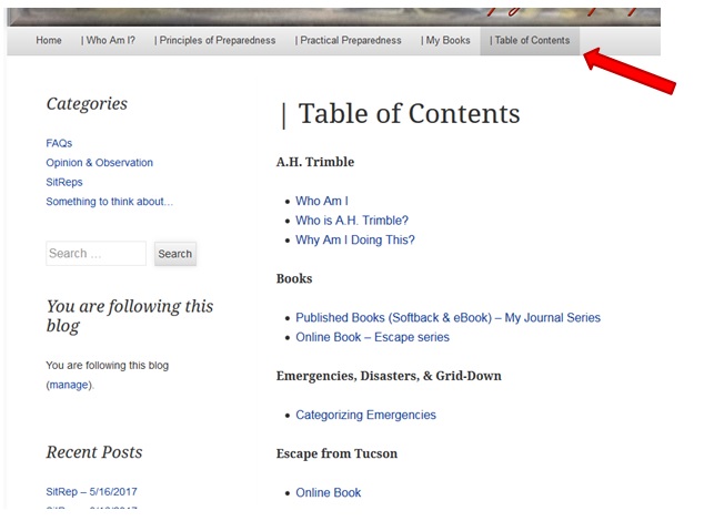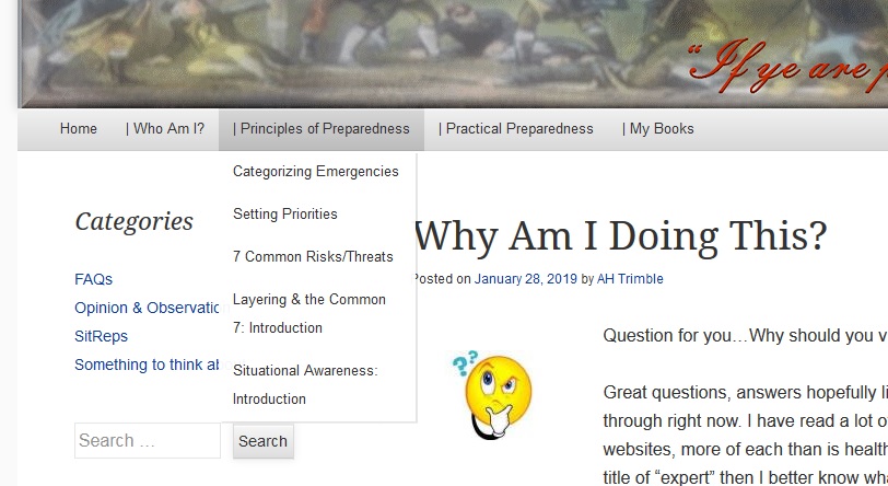 So, as you know by now there are two primary areas of how I view emergency preparedness; 1) principles, 2) the practicals. That is how I am going to organize the website. But, there are a couple other considerations as well; my books (published and online), as well as SitReps, FAQs, etc. So I do have to take those into consideration and weave them into the overall organization. I think I’ve got it now…but I may tweak it from time to time.