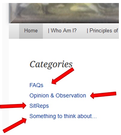 There are other areas of information, answered questions, observations, opinions, etc. Those articles will appear in categories on the left of your screen. Pick a category and a list of articles will appear on your screen…ALL of the articles related to the category. So the page may become rather long. Scroll down and read what you want.