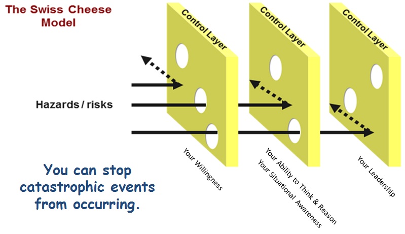 Looking at the visual of the Swiss Cheese model, the bad decisions are the holes and they all lined up to have a bad outcome, usually a catastrophic outcome. No person in the organization or process prevented the bad decision from proceeding; there was no slice of cheese blocking the way of the event occurring.