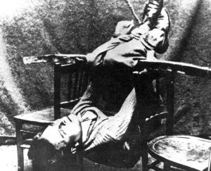 - He died of a crushed larynx and a severed spine.