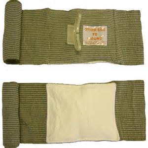 Dressing, First Aid, Camouflaged, 11 ¾” x 11 ¾” : This bandage is classified as a medium for larger wounds such as intestinal or larger areas of burns, etc. Dressing comes with 4 ties and are very absorbent (1 unit of blood).
