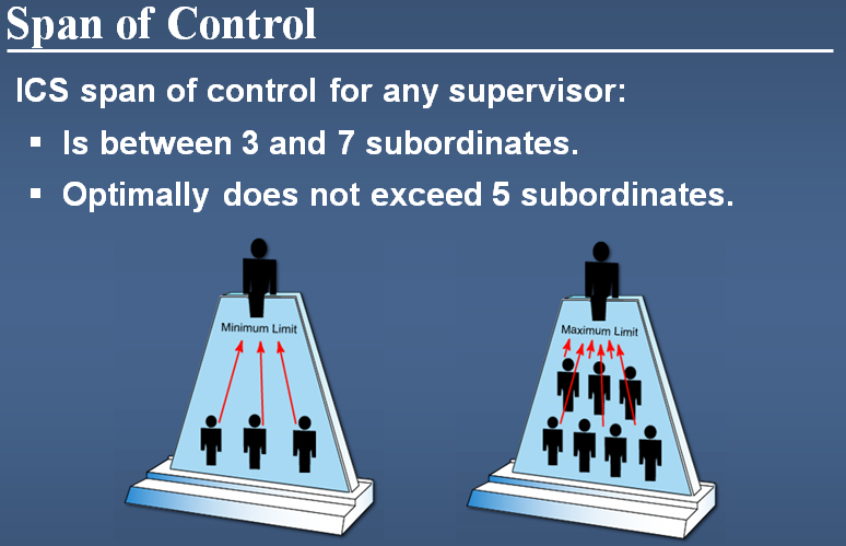 span of control. Research and practical experience has show that the average supervisor/leader can only effectively supervise/direct 3 – 7 people at any one time. The more precise number that is used is 5 in the average emergency situation.