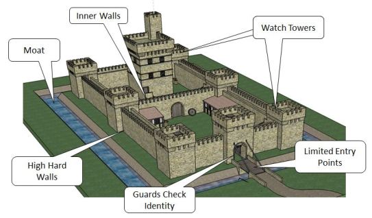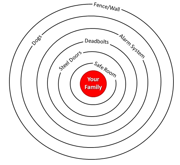 With each circle you keep the bad guy further from your castle, those you love and whom you are trying to protect. You have created defense in layers. You have an answer for each separate and consecutive threat. In other words, you have multiple layers of defense to protect your family. Each layer having a specific purpose.