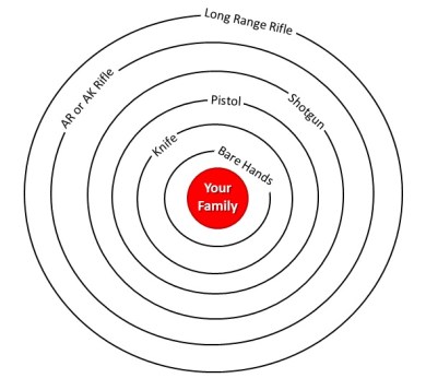 Now look at all those variations as concentric circles with you and your family in the center. The first circle is your bare hands capabilities. The next circle is a knife as a defensive weapon. The circle after that is a pistol. Then a shotgun, then an AR, and finally a long-range rifle.