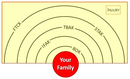 However, the TBAK is larger and heavier than an IFAK. It is meant to be carried when your family or team is working together away from more readily available medical aid. So it naturally now pushes the circle outward from just an individual.