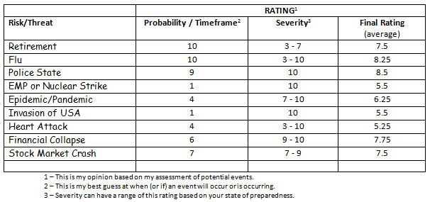 Now it gets fun! I will rate the top nine risk and threats that I feel my family and I face in our current national environment. After I do the rating and explain it I will talk about how to mitigate risks and threats in the final article in this series. Because, after all, mitigating the