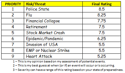 In my last article I wrote about what I feel are the most pressing issues that my family and I are facing at this particular time. Based on the ratings I assigned to each potential event here are the events in order of concern with the highest concern first: